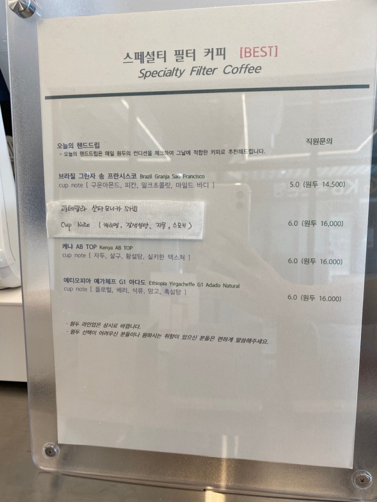 오늘의 커피라고 해서 아메리카노를 4가지 종류의 원두중에 직접 선택 가능했습니다.