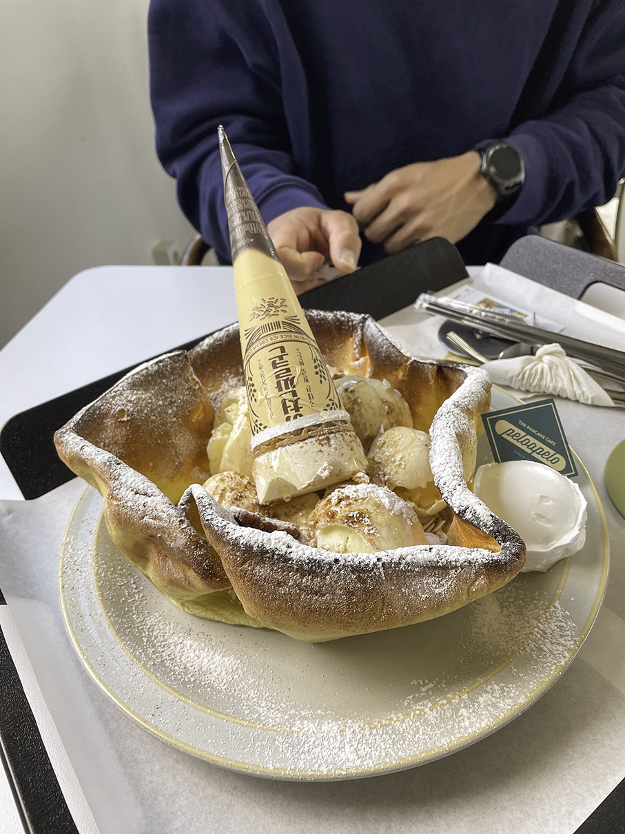 바삭바삭한 팬케이크 위에 아이스크림과 시럽 견과류들이 담아져서 나왔어요.