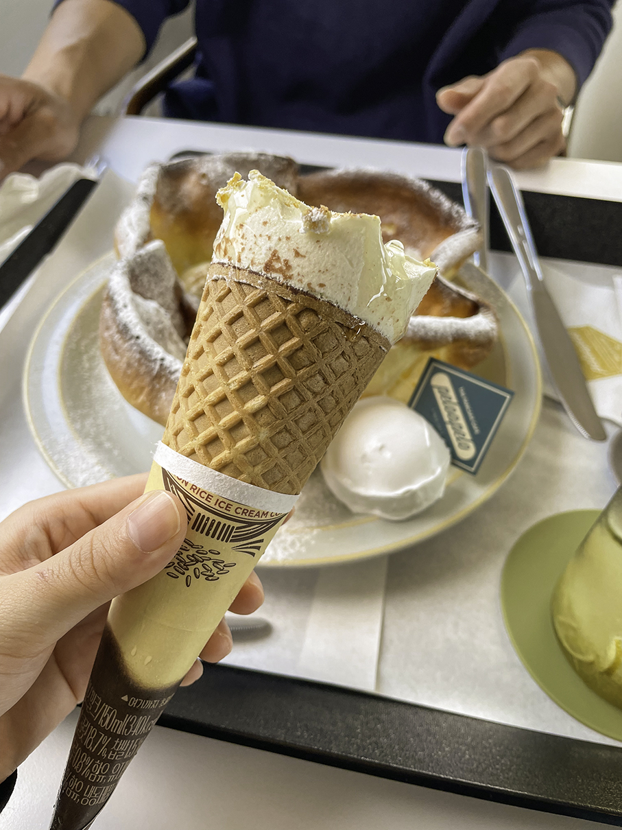 우선 바삭바삭한 쌀팬케이크를 잘라서 아이스크림과 생크림을 찍어서 먹었는데 첫 맛이 진짜 너무 맛있었어요.